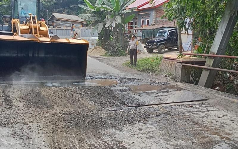 Bengkulu Utara - Babin Kamtibmas Polsek Batik Nau Melakukan Gatur Pada saat Alat Berat Melakukan Penimbunan Koral di titik Jembatan Paninjau yang rusak parah, Senin (11/12/2023).