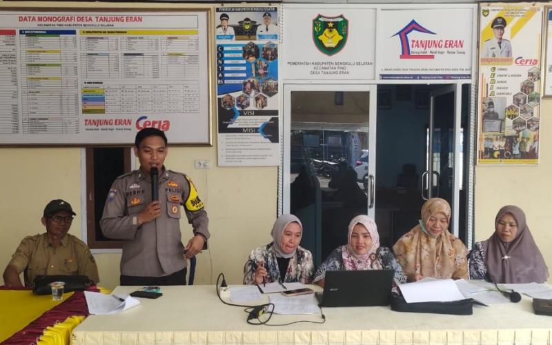 Bengkulu Selatan - Bhabinkamtibmas Polsek Pino Brigadir Jeffry dan Brigadir Redho Hadiri pencegahan dan penanganan stunting serta Gizi Buruk di Desa Tanjung Eran Kecamatan Pino Kabupaten Bengkulu Selatan, Sembari Jalin Keakraban, Selasa (30/07/24).