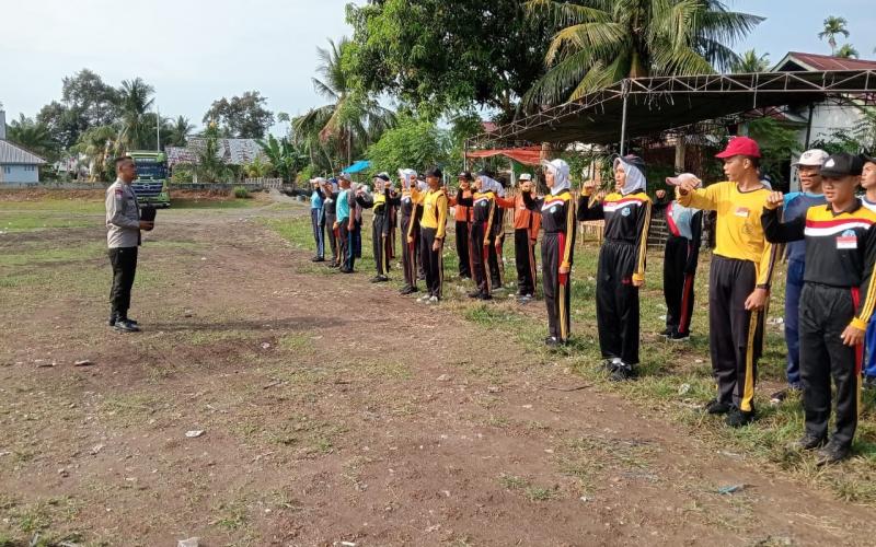 Terjun dalam Pelatihan, Bhabinkamtibmas Polsek Pino sembari menyampaikan pesan pesan kamtibmas tentang Peraturan Baris Berbaris sebagai dasar siswa siswi yang terpilih menjadi Pasukan Pengibar Bendera pada Upacara HUT RI ke-78 di Kecamatan Seginim.