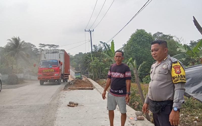Bengkulu Utara - Bhabinkamtibmas Aipda Deni Purba menyambagi masyarakat desa binaan yang sedang bekerja di proyek jalan, Kamis (19/10/2023).