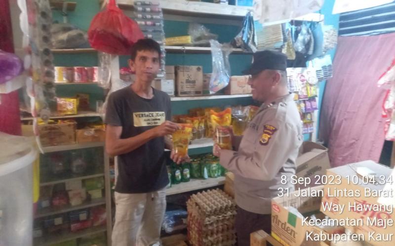 Kaur - Personel Polsek Maje Polres Kaur Polda Bengkulu, Aiptu Nur Wijayawan, S.Ikom, Aiptu Leza H, Bripka Buslan Aripin, Briptu Andre Wilian Pratama, dan Briptu Angga Putra Wijaya, melakukan pengecekan ketersedian dan harga minyak goreng dan bahan sembako di warung desa Wayhawang Kecamatan Maje Kabupaten Kaur, Jumat (08/09/2023), sekira pukul 09.00 WIB s/d Selesai.