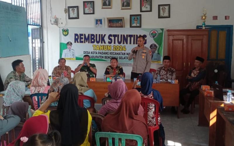 Bengkulu Selatan - Kapolsek dan Bhabinkamtibmas Polsek Manna Polres Bengkulu Selatan Polda Bengkulu, Iptu Asep Syahmulyana, S.Ikom, Aiptu Amrizal dan Aipda Hery NW hadiri rapat kerja Mini Lokakarya Pengendalian Stunting di Kantor Desa Kota Padang Kecamatan Manna Kabupaten Bengkulu Selatan, Kamis (01/08/24).