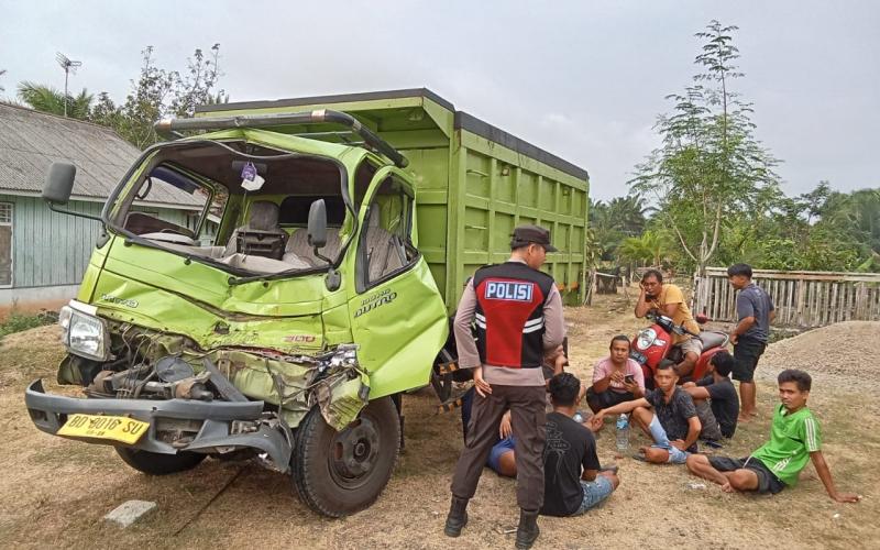 Kendaraan yang mengalami laka lantas yaitu truk Dutro Warna Hijau BD 8016 SU menabrak kendaraan truk warna merah bermuatan Sawit.