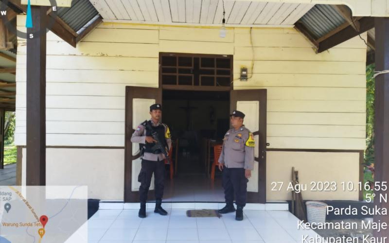 Kaur – Bhabinkamtibmas Polsek Maje Polres Kaur Polda Bengkulu, melaksanakan pengamanan Ibadah Minggu umat kristiani di Gereja-Gereja di wilayah hukum polsek Maje, Minggu (28/08/2023).