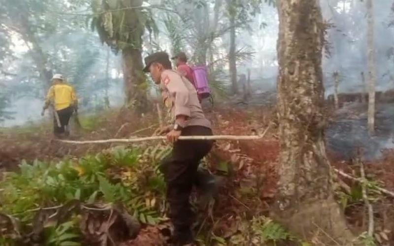 Bengkulu Utara - Personel Polsek Batiknau Polres Bengkulu Utara Polda Bengkulu, turun tangan bersama warga memadamkan kebakaran lahan kebun sawit milik warga di wilayah perkebunan Dusun Air Limas 1 yang berbatasan dengan lahan yang di Desa Samban Jaya Kecamatan Batiknau Kabupaten Bengkulu Utara, Selasa (17/10/2023).