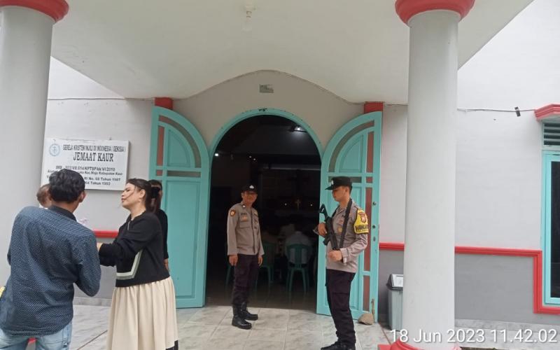 Kaur - Bhabinkamtibmas Polsek Maje Polres Kaur Polda Bengkulu, melaksanakan pengamanan Ibadah Minggu umat kristiani di Gereja-Gereja di wilayah hukum polsek Maje, Minggu (18/06/2023).