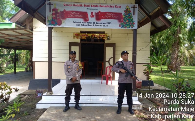 Kaur - Polsek Maje Polres Kaur Polda Bengkulu, melaksanakan Pengamanan ibadah umat kristiani di gereja di Wilayah hukum Polsek Maje Kecamatan Maje Kabuapten Kaur, Minggu, (14/1/2024) Pukul 10.00 WIB s/d Selesai.