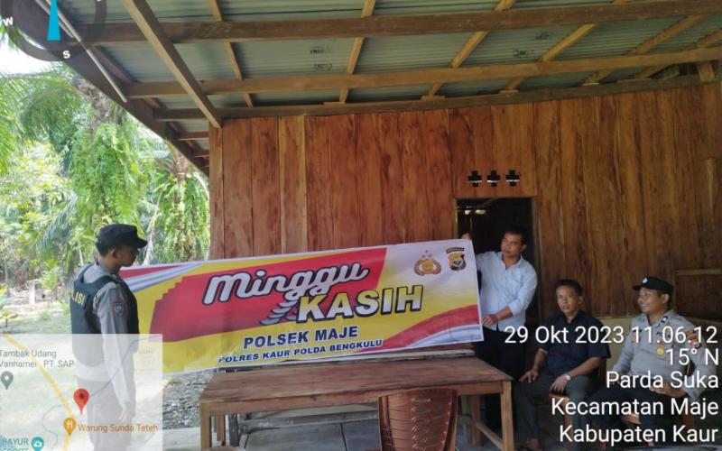 Kaur - Polsek Maje Polres Kaur Polda Bengkulu, melaksanakan kegiatan Minggu Kasih di Gereja Santo Benecditus Desa Parda Suka Kecamatan Maje Kabupaten Kaur, Pada hari Minggu (29/10/2023) sekira pukul 10.00 WIB.