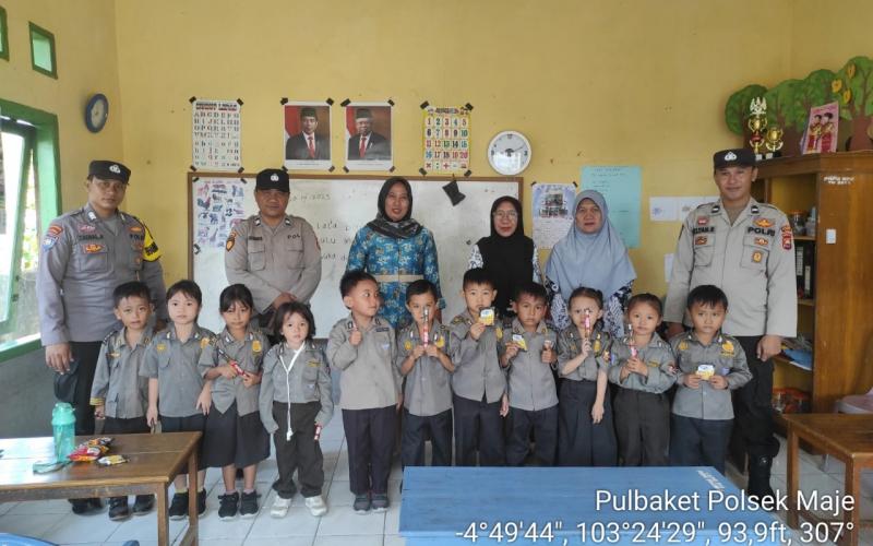 Kaur - Polsek Maje Polres Kaur Polda Bengkulu melaksanakan kegiatan Police Go To School di TK Negeri Sinar Pagi Desa Sumber Harapan Kecamatan Maje Kabupaten Kaur, Senin (30/10/2023) pagi.