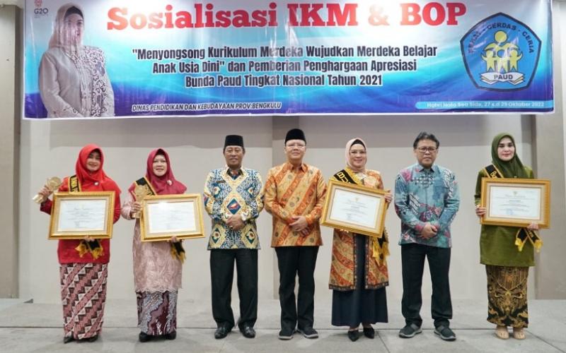 Klikwarta.com - Bunda PAUD Provinsi Bengkulu Derta Rohidin menerima penghargaan dari Menteri Pendidikan, Kebudayaan, Riset dan Teknologi (Mendikbudristek) Republik Indonesia Nadiem Makarim, atas kinerja dan kepedulian yang tinggi dalam mendukung program ‘Bergerak Bersama Menuju PAUD Berkualitas’.