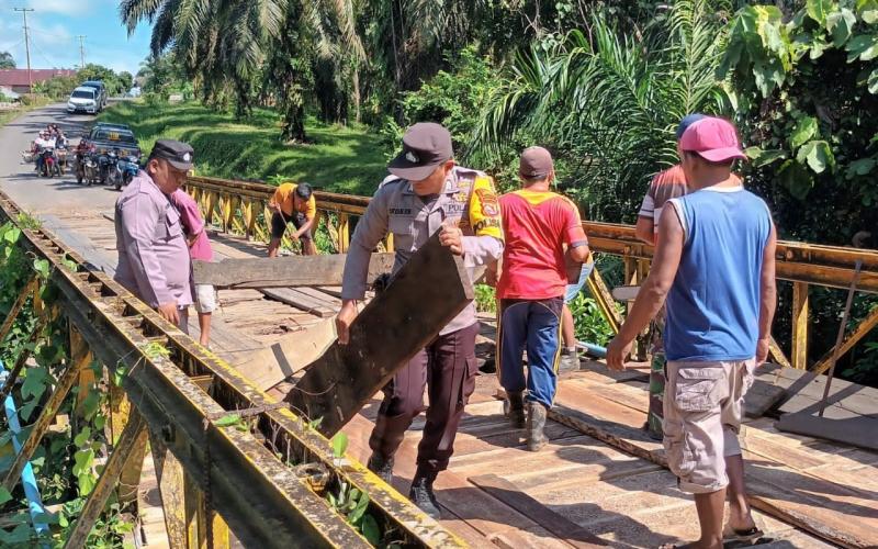 Kapolsek Giri Mulya Iptu Freddy Simaremare, SH menjelaskan anggota melakukan gotong royong bersama warga untuk mengganti sebagian papan kayu yang telah lapuk.